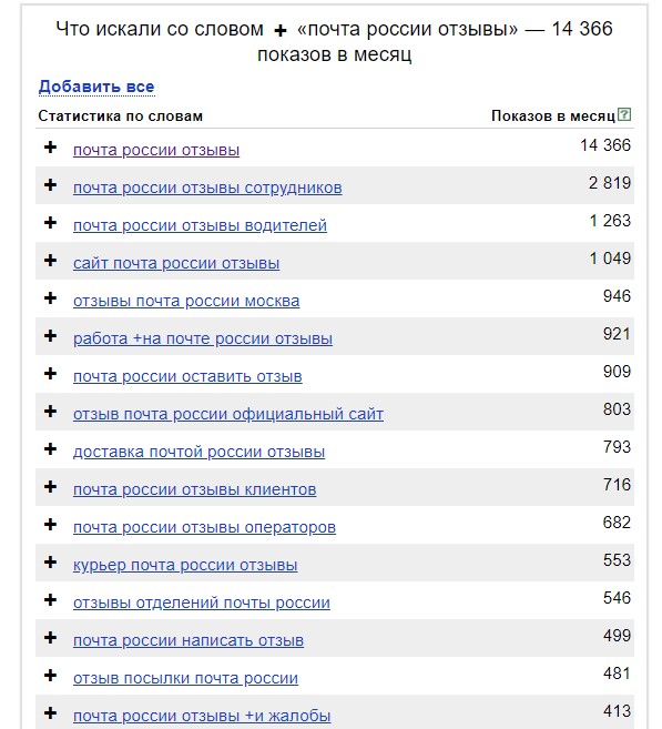 Для более полного списка репутационных запросов можно использовать сервис Wordstat.