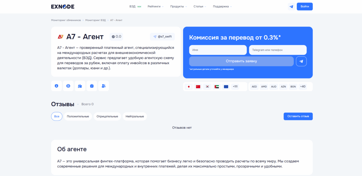 Агент А7 известен своей гибкостью и клиентоориентированностью. Он предоставляет полный цикл услуг: от проверки документов до быстрого зачисления средств на зарубежные счета. Отличается выгодными тарифами и широким выбором валют.