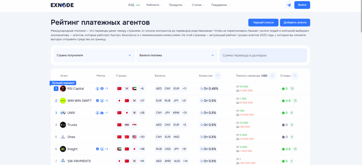 Exnode — это удобный инструмент, где собраны проверенные сервисы денежных переводов. Здесь можно сравнить предложения агентов, условия и скорость работы, а затем выбрать партнёра, который максимально соответствует вашим задачам.