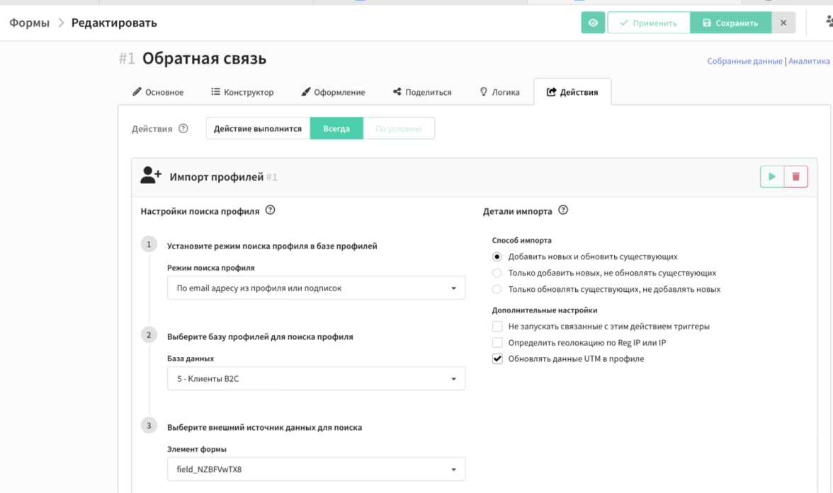 Также настраиваются действия, которые происходят после отправки формы — это импортирование в базу и/или отправка оповещений на определённый емайл. База данных пополняется из опросов через поиск по email, Message ID или дополнительному полю. То есть данные не потеряются и попадут в нужный профиль клиента.