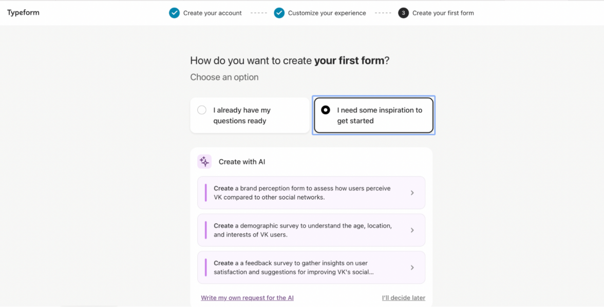 Если идей для опроса нет, сервис предложит воспользоваться искусственным интеллектом: робот подскажет решения после исследования сайта вашего бренда, который просят добавить в форму при регистрации.