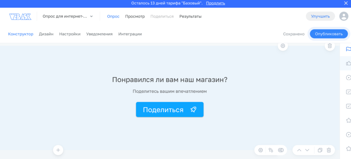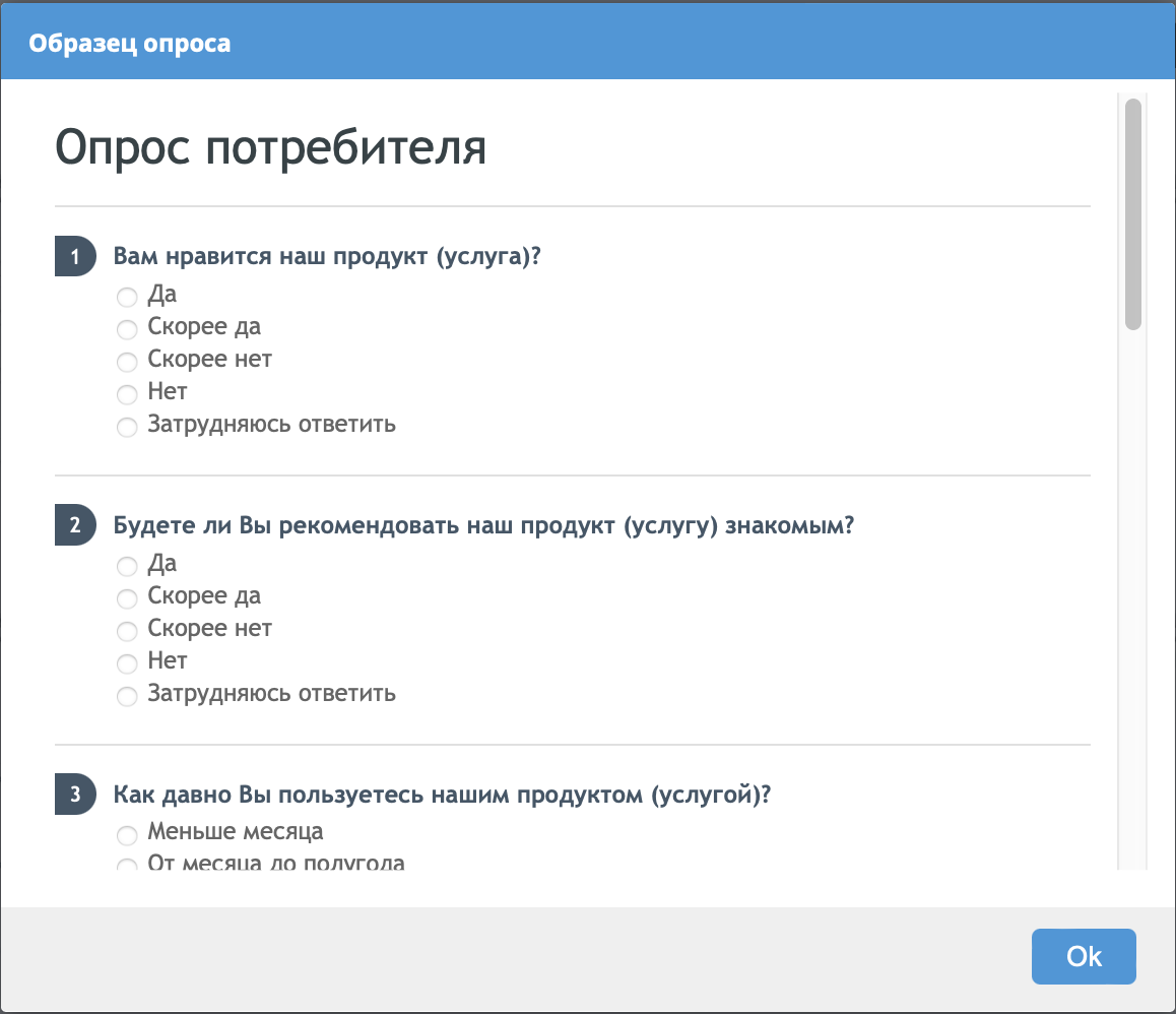 В Survivo 19 типов вопросов, поэтому ваш интернет опрос получится разнообразным, если это нужно. Клиент сможет дать ответ через рейтинг звёздочками, цифрами, ползунок со шкалой и так далее.