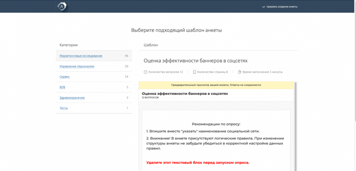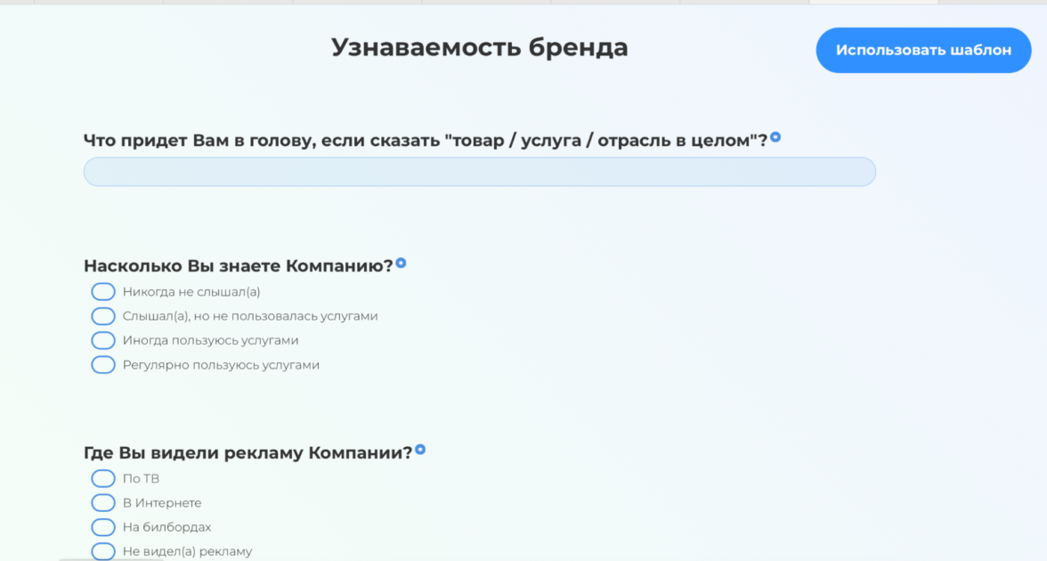 Сервис, где для создания опросника есть 22 варианта вопросов и готовые шаблоны. Здесь нет разнообразия дизайнов, но достаточно готовых форм для исследования мнения клиентов об эффективности рекламы, баннеров, особенностях потребления продуктов компании, оценке дизайна сайта, упаковки и других.