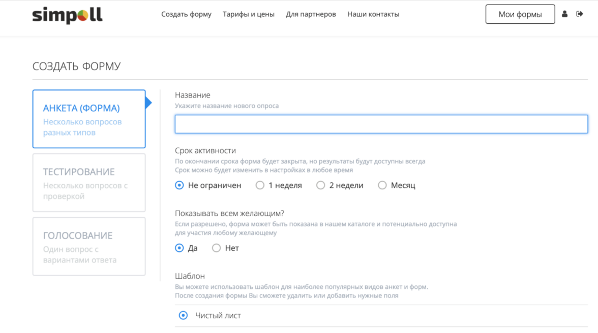 У Simpoll очень простой интерфейс конструктора, где сразу устанавливают ограничения (срок опроса), выбирается шаблон или вариант создания с нуля. В формах настраиваются стиль, цвет и другие элементы.
