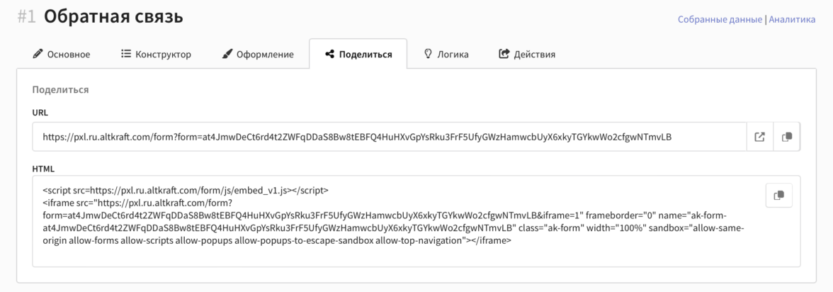 Когда форма готова, ей можно поделиться, но сначала активировать — нажать «Опубликовать». Тогда во вкладке «Поделиться» появится ссылка и HTML-код, которые вставляются на нужные ресурсы.