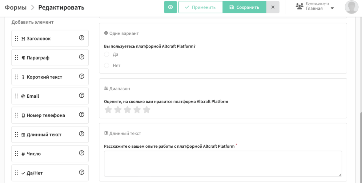 Формы Altcraft Platform — это простое и гибкое создание опросов, анкет и форм обратной связи. В интуитивно понятном редакторе вы найдёте разные форматы вопросов под ваши потребности: один вариант ответа или несколько, с ограничением на количество символов для заполнения или без, шкалу для оценки.