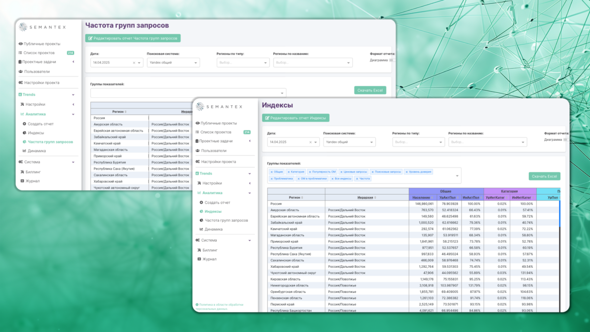 Semantex.TRENDS — комплексное решение для автоматизированного и удобного анализа данных о поисковом спросе, позволяющее глубоко понимать потребности потребителей и стратегически руководить своим брендом, выбирая наиболее перспективные направления для роста и развития. Адаптированность и масштабируемость данного инструмента делают его подходящим как для крупных федеральных брендов, так и для региональных компаний, заинтересованных в повышении своей конкурентоспособности.