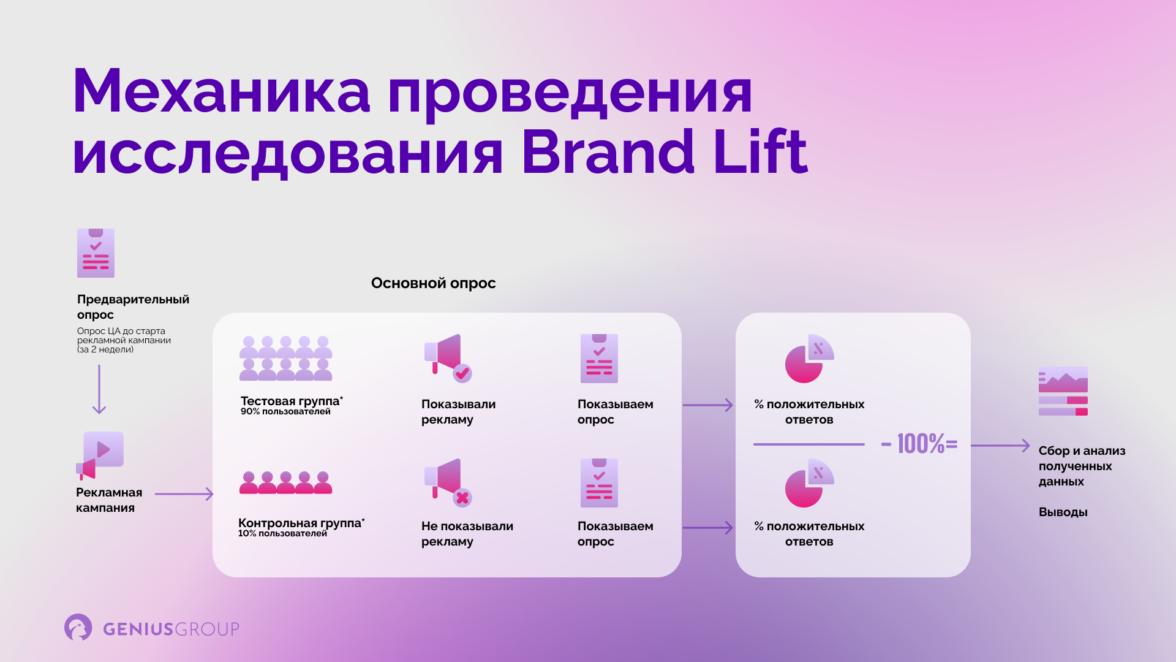 В случае баннерной кампании опрос появляется непосредственно в поле баннера, а если речь идет о видео — в окне видеоплеера. Чтобы статистика была достоверной, аудитория делится на две группы: те, кто видит рекламу (тестовая группа) и те, кто не видит (контрольная группа). Есть способ сделать оценку еще более точной — сделать предзамеры до начала РК: так мы получим контрольную группу, которая со 100% вероятностью не соприкасалась с рекламной кампанией ни в каком виде. По отличиям в показателях между предзамером и замером в контрольной группе в течение РК можно оценить медиашум — то, как реклама повлияла даже на тех, кто не видел ее непосредственно.