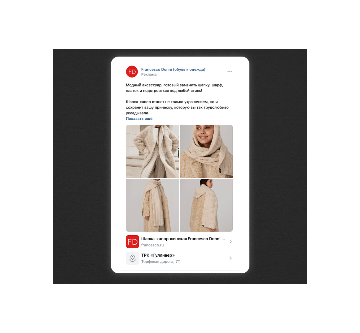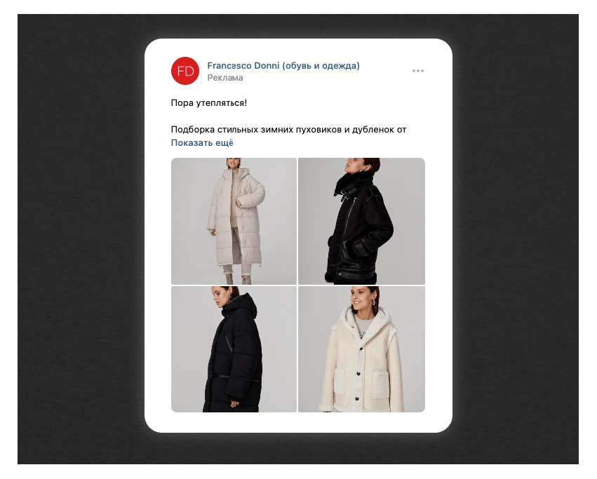 Первое касание. На первое касание мы выделили 40% бюджета на рекламу. Перед нами стояла задача перевести людей из холодной аудитории в теплую по минимальной цене. Поэтому решили делать не обычные посты, а создали рекламные объявления с сезонными подборками товаров.