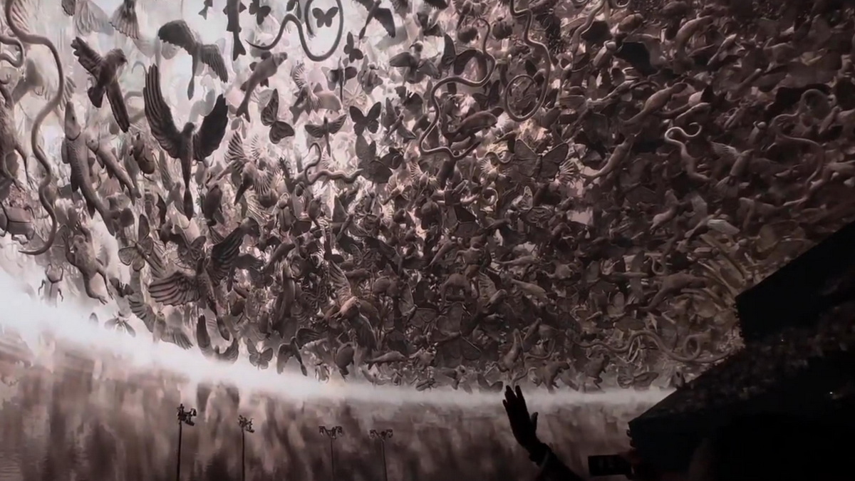 Зрители следуют за камерой внутрь объекта, где бурлит генезис, завершающийся творением зверей и птиц.