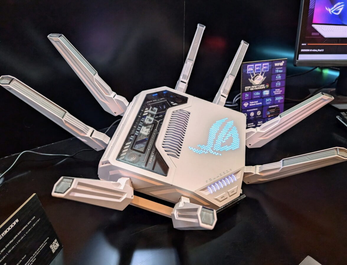 Роутер Asus ROG Rapture GT-BE19000AI, по утверждению его создателей — первый роутер с сетевым процессором, способный с помощью технологий искусственного интеллекта блокировать рекламу, трекеры и зловредные сайты, улучшать качество связи по Wi-Fi и даже экономить электроэнергию. Цена — $800.