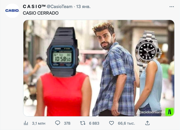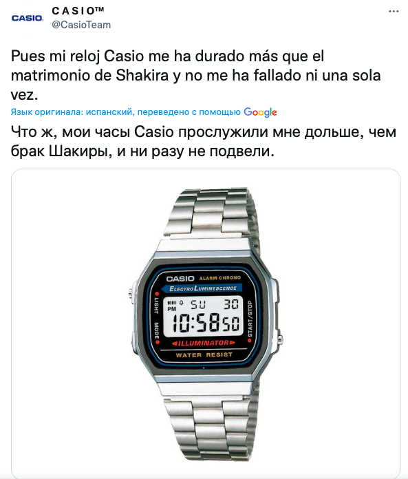Но неофициальный испаноязычный аккаунт команды Casio в Twitter @casioteam опубликовал с 12 января десятки твитов, в том числе с довольно жесткими шутками. Например, о том, что часы Casio прослужили дольше, чем брак Шакиры, и ни разу не подвели.