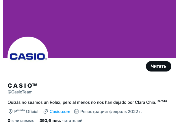 Шуточные посты неофициального аккаунта набирают миллионы просмотров и десятки тысяч ретвитов, за несколько дней на него подписались 250 тысяч новых пользователей. А в описании канала теперь красуется фраза «Может, мы и не Rolex, но нас хотя бы не бросили ради Клары Чиа».