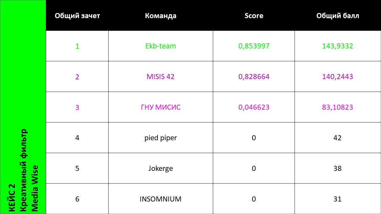 Первое место заняла команда Ekb-team из Екатеринбурга. Троим ее участникам по 20-21 году (Дмитрий Грязнов, Равиль Камалиев, Вениамин Бобаков), они третьекурсники Уральского федерального университета (УФУ), Института радиоэлектроники и информационных технологий УФУ и Уральского госуниверситета путей сообщения. Параллельно с учебой ребята работают в компаниях Web-Regata, «Тензор» и Neurollab на должностях разработчиков (backend, middle, frontend), а также DL-инженера. 19-летний Александр Исаков учится в Москве на первом курсе Российского университета транспорта (МИИТ) и трудится в «Билайне» дизайнером (middle+product). Артему Пивко 17 лет, он учится в екатеринбургской школе №215 и занимает должность разработчика (middle, frontend) в компании MadTest.