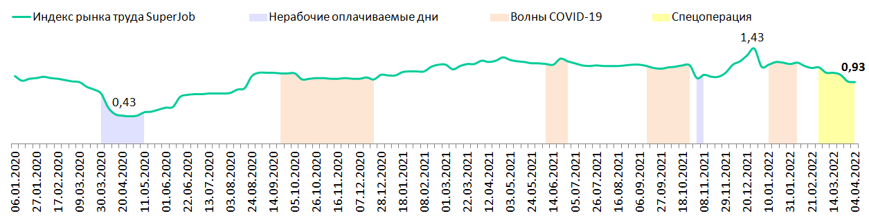 Индекс активности работодателей SuperJob продолжает снижаться. Хотя за прошедшую неделю сокращение составило всего один процентный пункт, уже сейчас на графике можно увидеть, что значения ниже, чем во время второй волны коронавируса осенью 2020-го, и сопоставимы с августом пандемийного года, когда рынок еще не до конца оправился от локдауна.