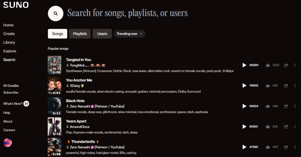 Explore. За время работы в Suno появилось множество новых уникальных музыкальных направлений: электрошансон, китайский математический рок, французский или кельтский дабстеп и другие. Познакомиться с ними можно именно в этом разделе.