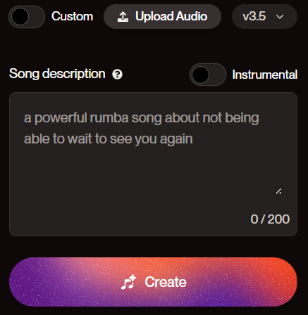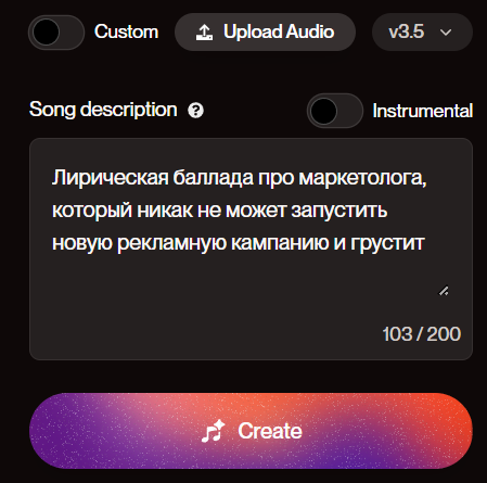 Шаг 1. Кликаем по разделу Create. Не смотрим пока что на переключатель Custom. Он потребуется для создания песен на свои слова. Также не обращаем внимания на ползунок Instrumental. Он необходим, если мы пишем трек без слов. Сейчас Instrumental тоже оставляем неактивным. В верхнем правом углу выбираем версию. По умолчанию ставится последняя.