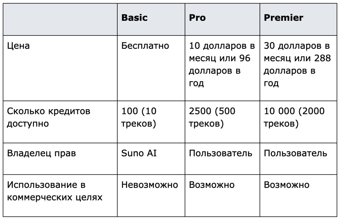 Для создания в Suno AI более десяти треков в день надо или зарегистрировать новый аккаунт, или платить за подписку картой зарубежного банка. Основная причина приобрести подписку — авторские права на треки. Использовать аудио в коммерческих целях на бесплатном тарифе нельзя.