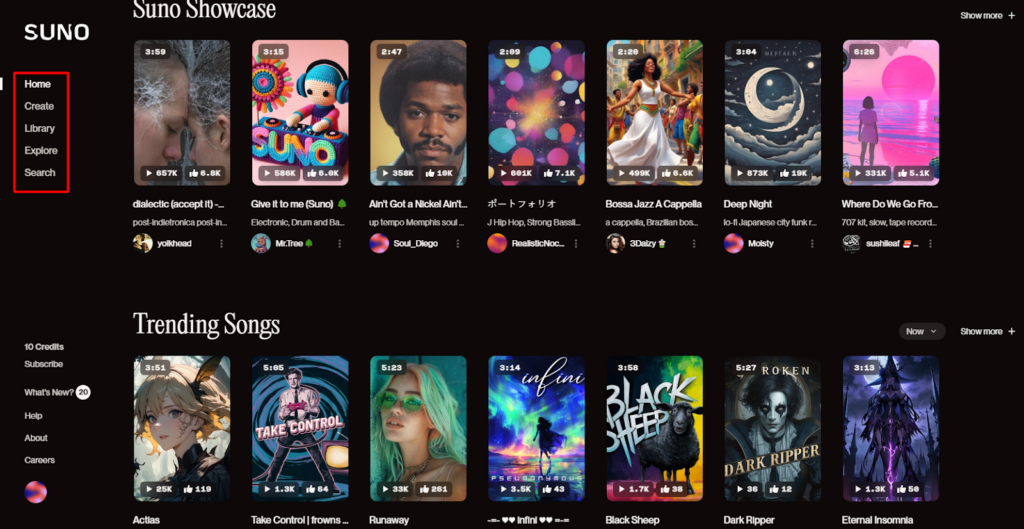 В интерфейсе Suno есть пять разделов.