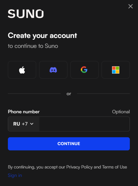 Авторизоваться в Suno AI можно через аккаунт в Google, Apple, Discord или Microsoft, а также по номеру телефона. Сервис работает в России без ограничений. Создавать аккаунт с другим регионом не надо.