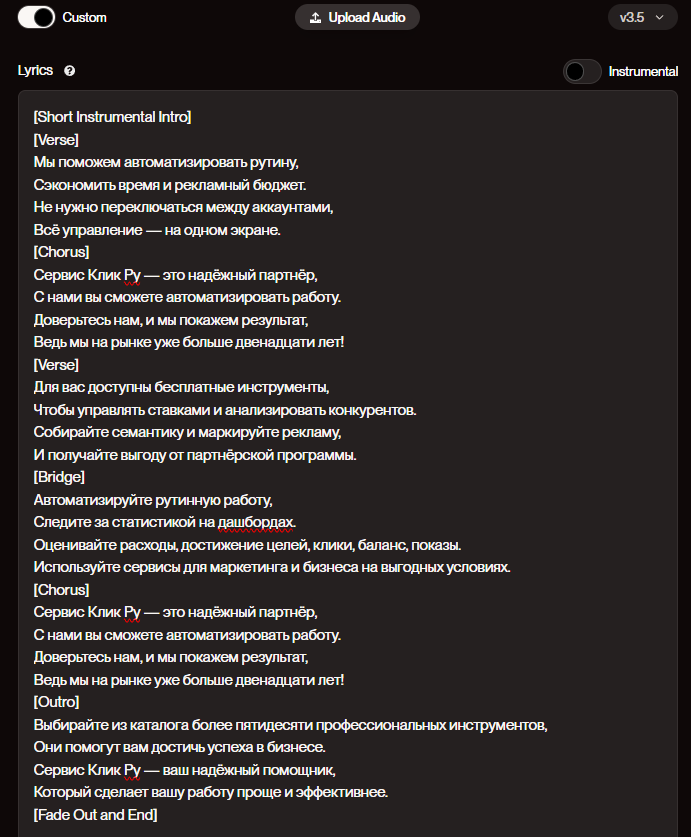Попробуем протестировать инструмент и создать текст песни про преимущества click.ru через YandexGPT: в тексте должно быть рассказано про инструменты для бесплатной маркировки рекламы, партнерскую программу с возможностью вернуть проценты от расходов на рекламу, инструменты для автоматизации рекламных кампаний и другое. Вышло не идеально, но не стоит забывать, что модели быстро обучаются.