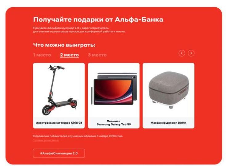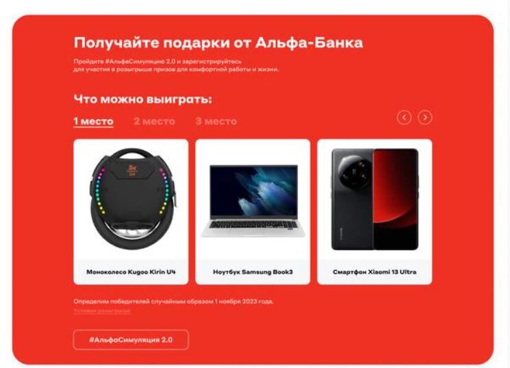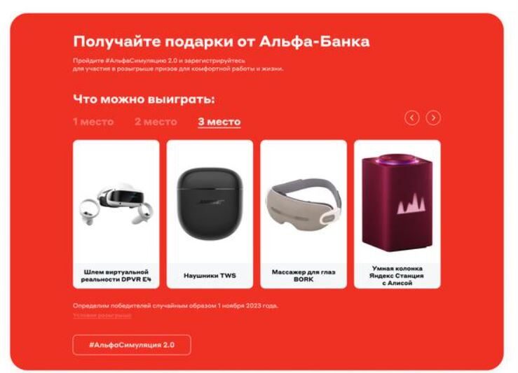 Продумали для участников симуляции и бонусы. Каждый, кто доходил в игре до конца, мог зарегистрироваться в розыгрыше призов. Да, видеоинтерактив полезен сам по себе, так как даёт возможность посмотреть вглубь компании, но шанс выиграть функциональные и современные гаджеты от Альфа-Банка привлёк к нему ещё больше внимания.