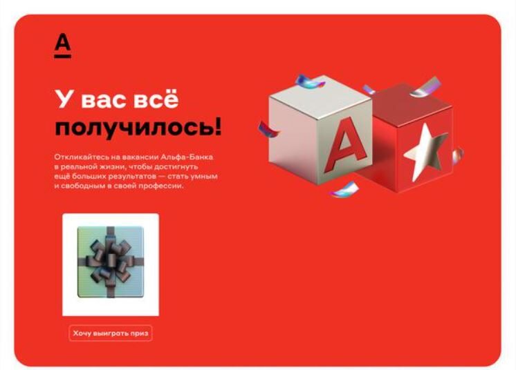Если самым удачливым достались самокат, планшет или массажёр, то самым внимательным, обнаружившим в игре пасхалку, — бесплатная карьерная консультация от сотрудника Альфы.