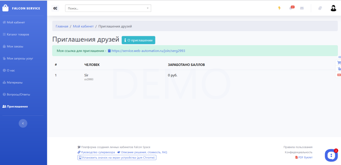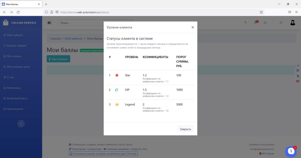 Программа лояльности в личном кабинете готового решения Falcon Service