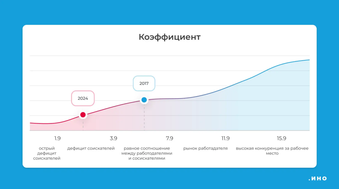 Некоторые руководители скажут, что основная мотивация сотрудника заключается в зарплате. Но людей не удерживают деньги, они всё равно уходят, если работать некомфортно. В сложившемся дефиците кадров на рынке труда России работники могут себе это позволить: исследование от исследование от HH.ru показывает, что в 2024 году на рынке труда на каждую открытую вакансию претендует всего три соискателя. Это практически лишает работодателя выбора. Для сравнения, в 2017 году коэффициент составлял 1:7, а HH.ru считает здоровым показатель от 4 до 8. Сейчас компании остро конкурируют за квалифицированных рабочих, инженеров, линейный персонал и IT-специалистов.