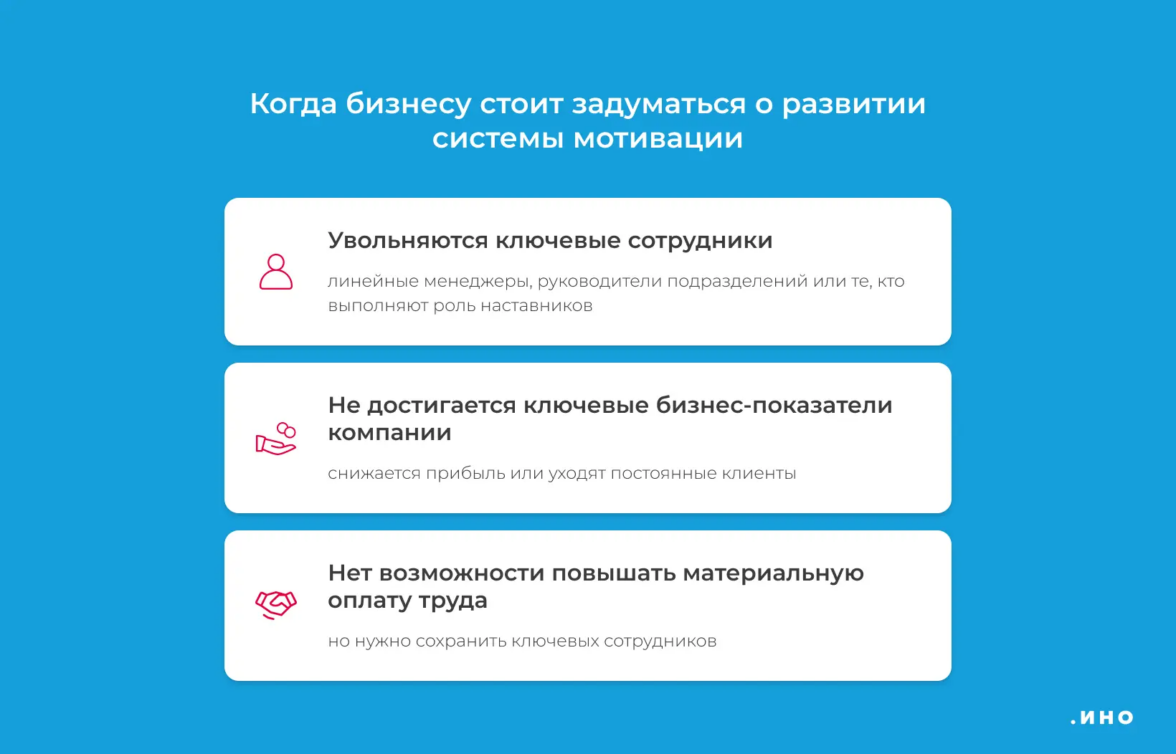 Компании стоит развивать систему мотивации, если увольняются ключевые сотрудники, не достигаются основные бизнес-показатели или нужно дополнительно стимулировать коллектив.