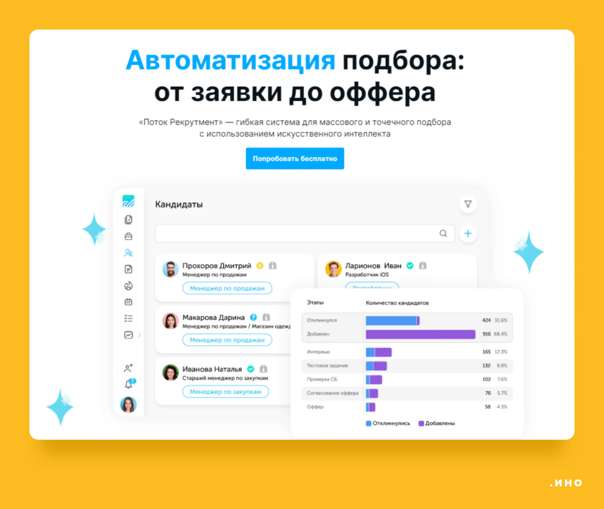 «Поток» — Платформа автоматизирует процесс подбора от открытия вакансии до оффера. Помогает в этом чат-бот, который берёт рутину на себя. Подходит для крупных компаний, которым нужно большое количество линейного персонала или волонтёров.