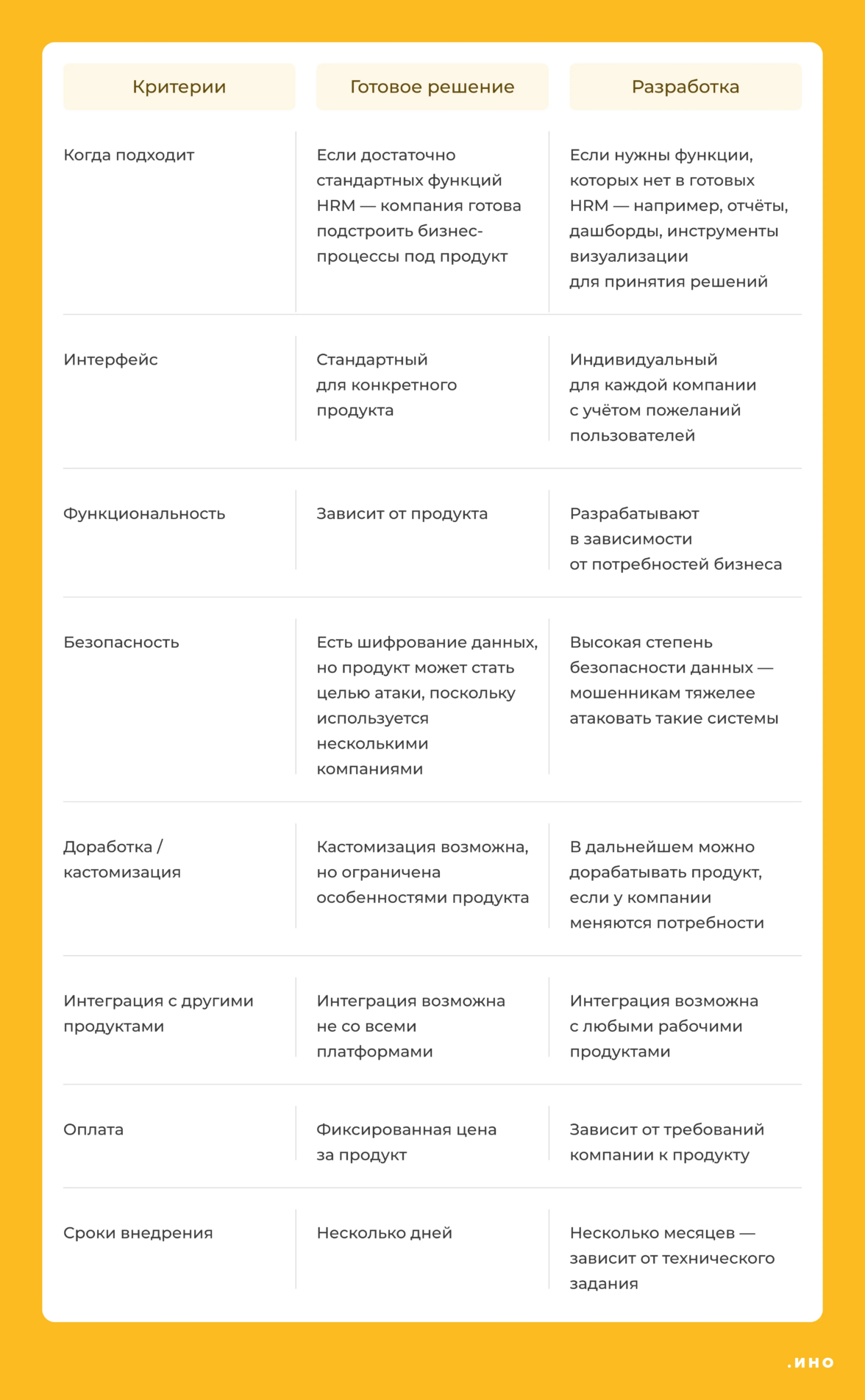 Если же в компании планируют масштабирование или нужны функции, которых нет в популярных HRM, стоит выбрать разработку с нуля. Такой подход требует больше времени и бюджета, но при этом вы получаете платформу, которая сделана с учётом потребностей компании. В будущем её можно дорабатывать и развивать.