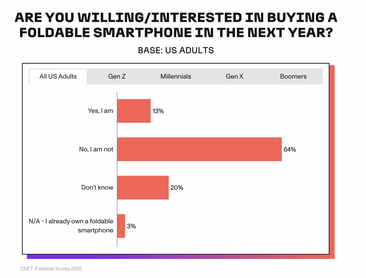 Несмотря на уникальный форм-фактор, выделяющий складные смартфоны на общем однообразном фоне, потребители не торопятся менять нераскладывающиеся смартфоны на раскладывающиеся. В ходе опроса, проведенного CNET, выяснилось, что только 3% американцев уже пользуются складными смартфонам. Планирует в течение ближайшего года купить смартфон с гибким экраном примерно каждый восьмой опрошенный (13%). Не знает, стоит ли покупать складной смартфон или нет — каждый пятый (20%). Подавляющее большинство (64%) не будет покупать «раскладушку».