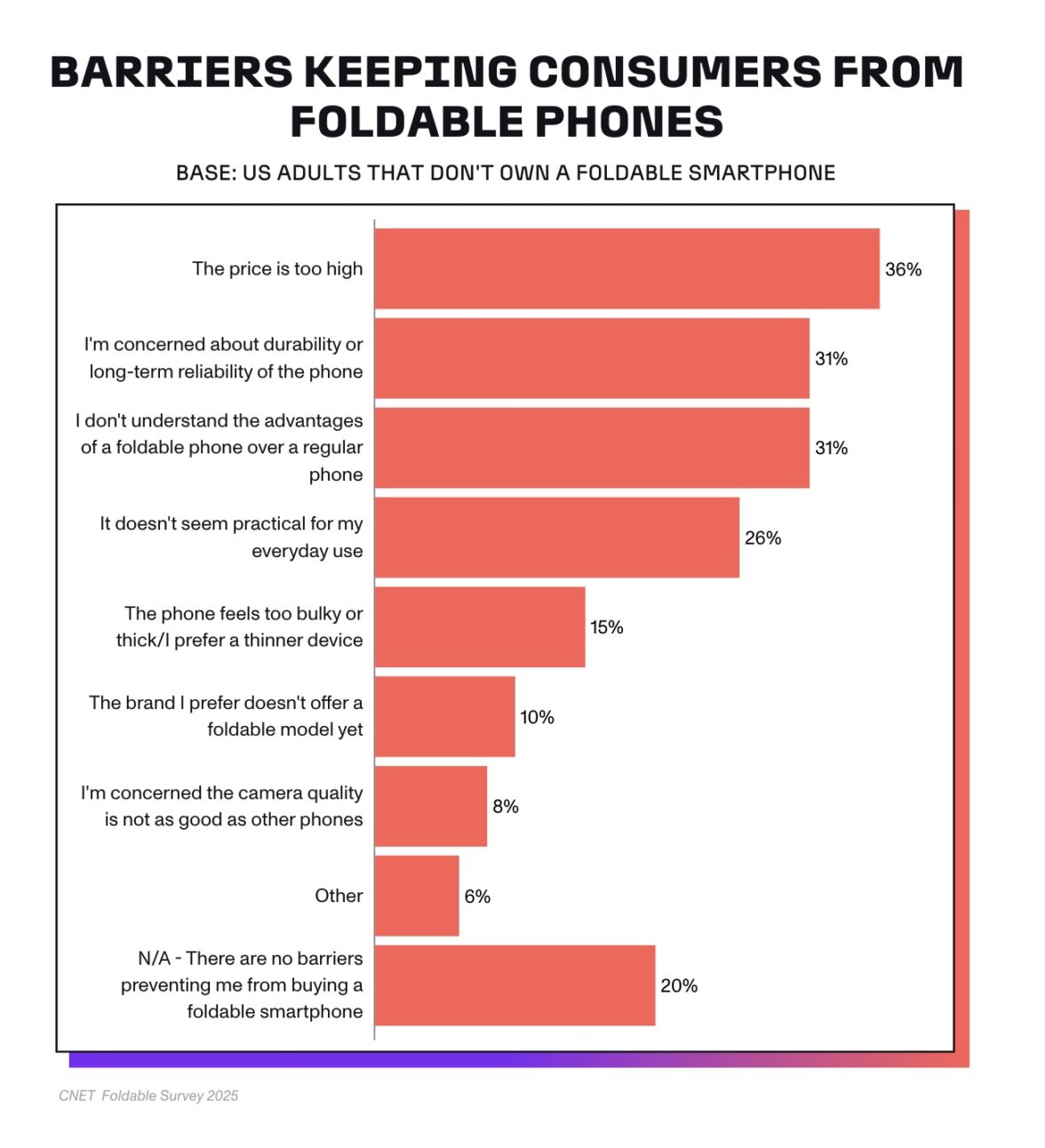 По какой причине американцы, у которых нет складного смартфона, не хотят его покупать. Опрошенные могли дать несколько вариантов ответа. Сверху вниз: слишком высокая цена; беспокойство по поводу долговечности и долгосрочной надежности; не кажется практичным для ежедневного использования; не видно преимуществ перед обычным смартфоном; устройство слишком громоздкое и толстое, предпочитаю более тонкий смартфон; любимый бренд не выпускает таких телефонов; опасения за качество камеры по сравнению с обычными смартфонами; другое; ничто не мешает покупке.