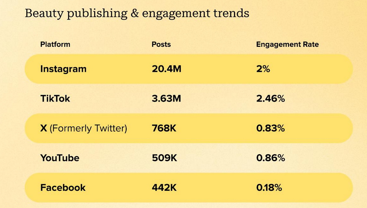 Индустрия красоты занимает второе место по количеству упоминаний в соцмедиа. В 2023 году о брендах косметики и средств для ухода за телом в соцсетях было размещено 25,8 млн постов со среднем показателем вовлеченности 2%. Больше всего инфлюенс-публикаций было размещено в Instagram (20,4 млн постов), а меньше всего в Facebook* (442 тыс.).