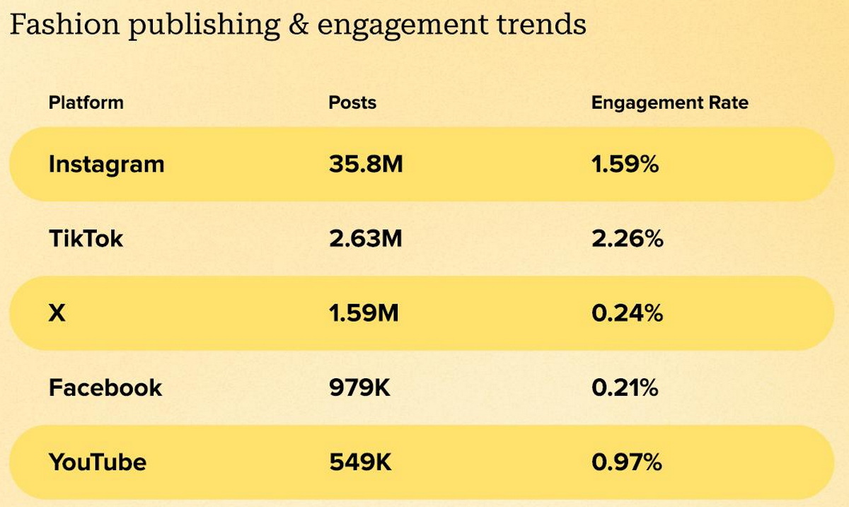 Для производителей одежды, обуви и аксессуаров соцсети – один из главных каналов продвижения. В прошлом году бренды этого сегмента были упомянуты в постах и комментариях 41,6 млн раз. Показатель вовлеченности сегмента составил 1,59%, а самой популярным соцмедиа стал Instagram* со 35,8 млн постов и комментариев на эту тему. Но уровень вовлеченности все равно выше в TikTok – 2,26%.