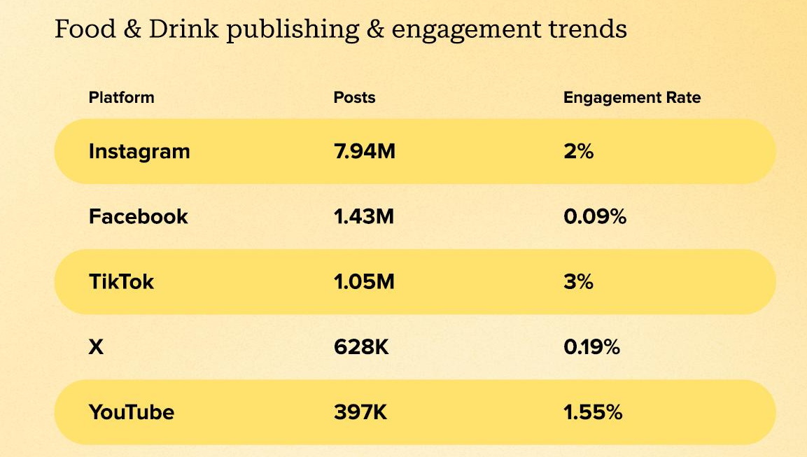 На четвертом месте с 11,5 млн постов и уровнем вовлеченности 1,19% оказалась категория «Еда и напитки». Главной площадкой постов про съедобное и питьевое стал Instagram, где число постов про вкусняшки превысило 7,9 млн. Вторым по популярности соцмедиа стал Facebook, где своими гастрономическими впечатлениями пользователи соцсетей поделились 1,43 млн раз. Вот только показатель уровня вовлеченности здесь совсем не аппетитный – всего 0,09%.