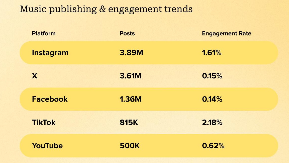 Замыкает топ-5 бренды музыкальной индустрии. Про свои музыкальные лейблы, песни и сервисы было написано 10,2 млн постов. Показатель уровня вовлеченности составил 1,6%. Лидерами по количеству публикаций стали Instagram и X, где по этому показателю соцмедиа практически сравнялись: 3,89 млн и 3,61 млн сообщений. Но по уровень вовлеченности соцсеть Марка Цукерберга опережает платформу Илона маска в 10 раз: 1,61% против 0,15%.