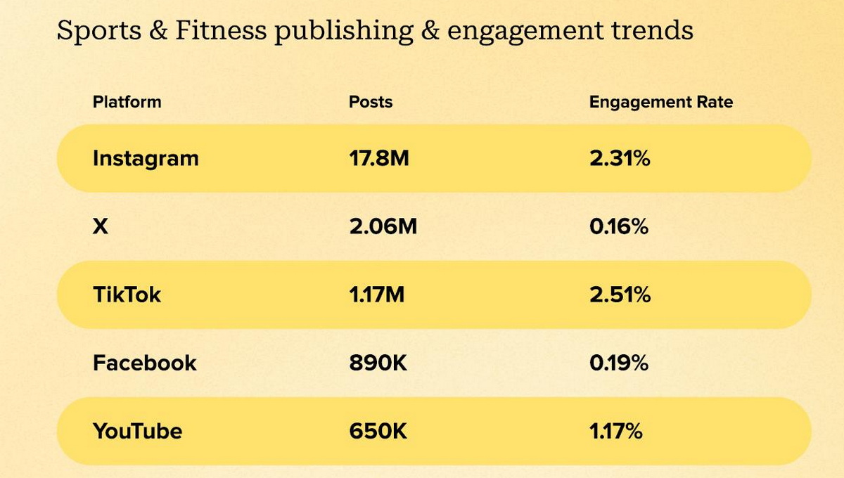 22,6 млн постов в прошлом году были посвящены товарам для спорта и фитнеса, которые по этому показателю заняли третье место рейтинга. Средний уровень вовлеченности сегмента составил 1,6%. Как и у всех других сфер бизнеса наибольшее число публикаций было размещено в Instagram* (17.8 млн сообщений). При этом, второе месте по количеству сообщений в сегменте заняла соцсеть X, где этот показатель составил 2,06 млн. Но размещение на этой платформе удачным назвать нельзя: уровень вовлеченности здесь составляет всего 0,16%, что более чем в 10 раз меньше среднего показателя.