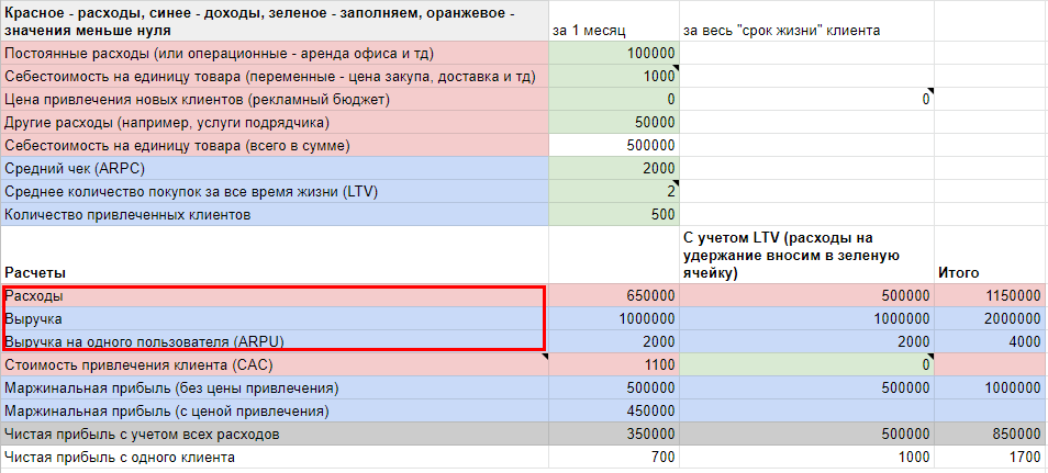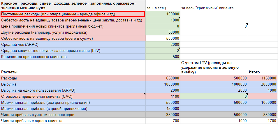 Часто бизнес не растет, потому что рассчитывает общую окупаемость, а не маржинальную прибыль. В калькуляторе в цену привлечения мы постоянные расходы не включаем. Но включаем их в расчет чистой прибыли.