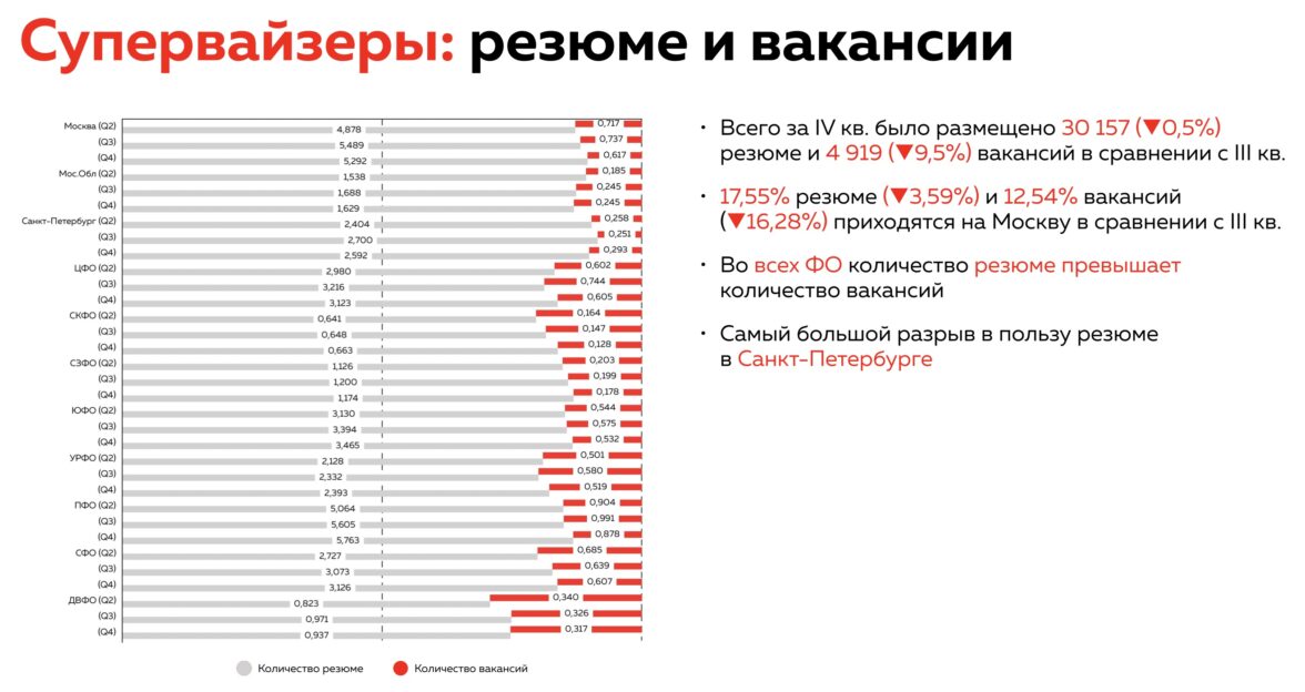 Из результатов исследования можно сделать вывод, что трудности с подбором массового линейного персонала по ряду должностей преувеличены: так, соотношение резюме к вакансиям супервайзеров в IV квартале 2024 года составило шесть к одному по всей России. Самый большой разрыв в пользу резюме был зафиксирован в Санкт-Петербурге — их число превысило вакансии в десять раз (2,4 тыс. резюме против 258 вакансий).