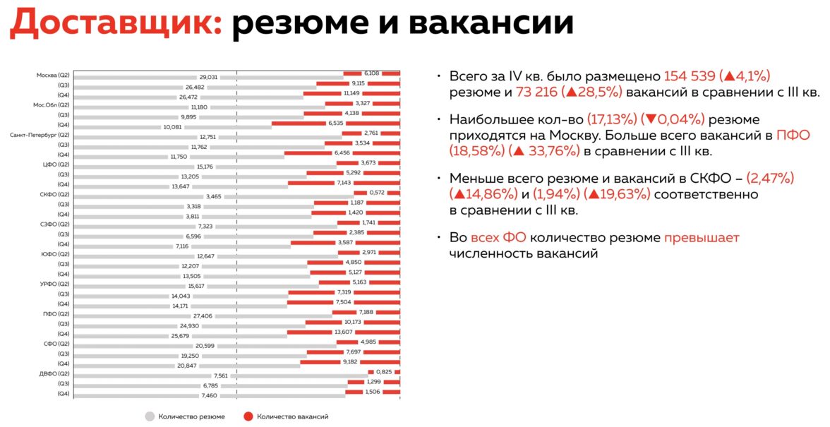 Резюме доставщиков и кладовщиков вдвое больше, чем вакансий. Так, за четвертый квартал в России было размещено 154,5 тыс. резюме доставщиков и 73,2 тыс. вакансий. По данным HeadHunter, к концу 2024 года в топе самых популярных профессий в России курьеры заняли 13-место, обойдя программистов.