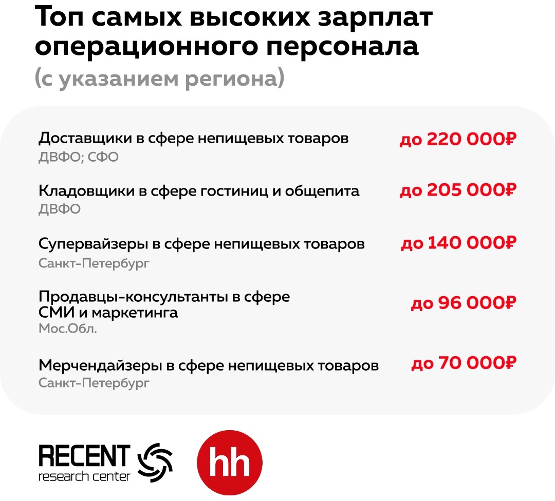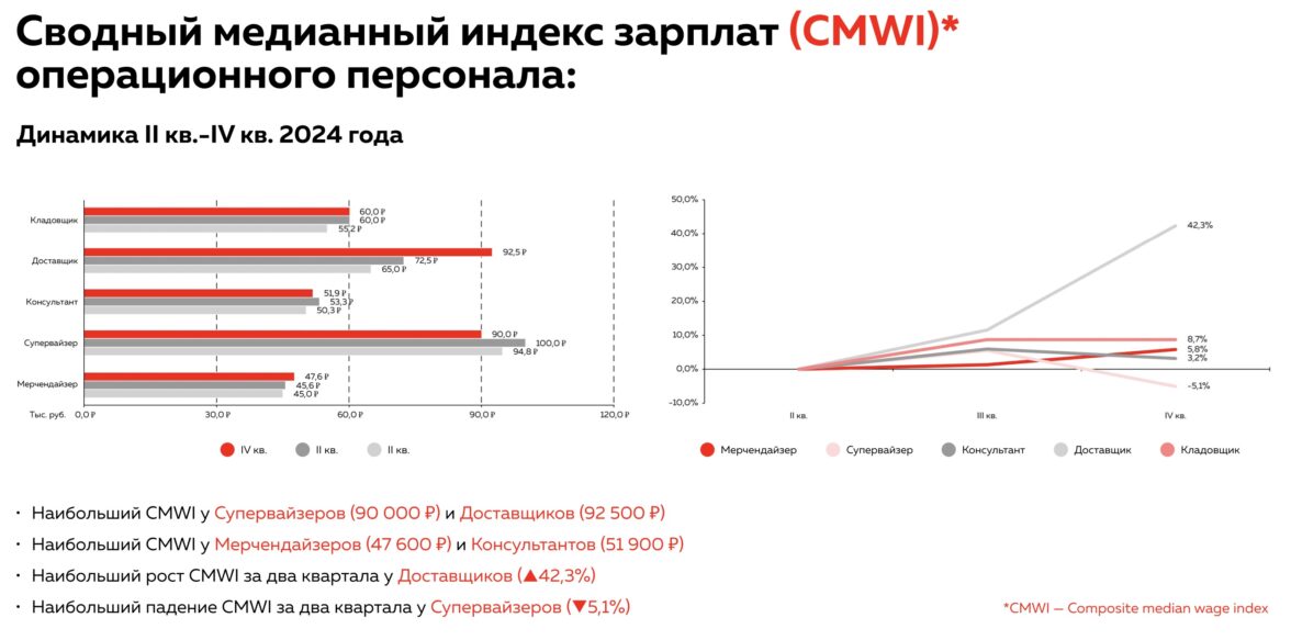 Больше всего среди изученных должностей зарабатывают доставщики. Их сводный медианный индекс зарплат (СMWI) вырос на 42,3% за два квартала и составил 92,5 тыс. рублей. Первое место в топе самых высоких зарплат среди операционного персонала заняли доставщики непищевых товаров в дальневосточном и Сибирском федеральных округах — они получают до 220 тыс. рублей.