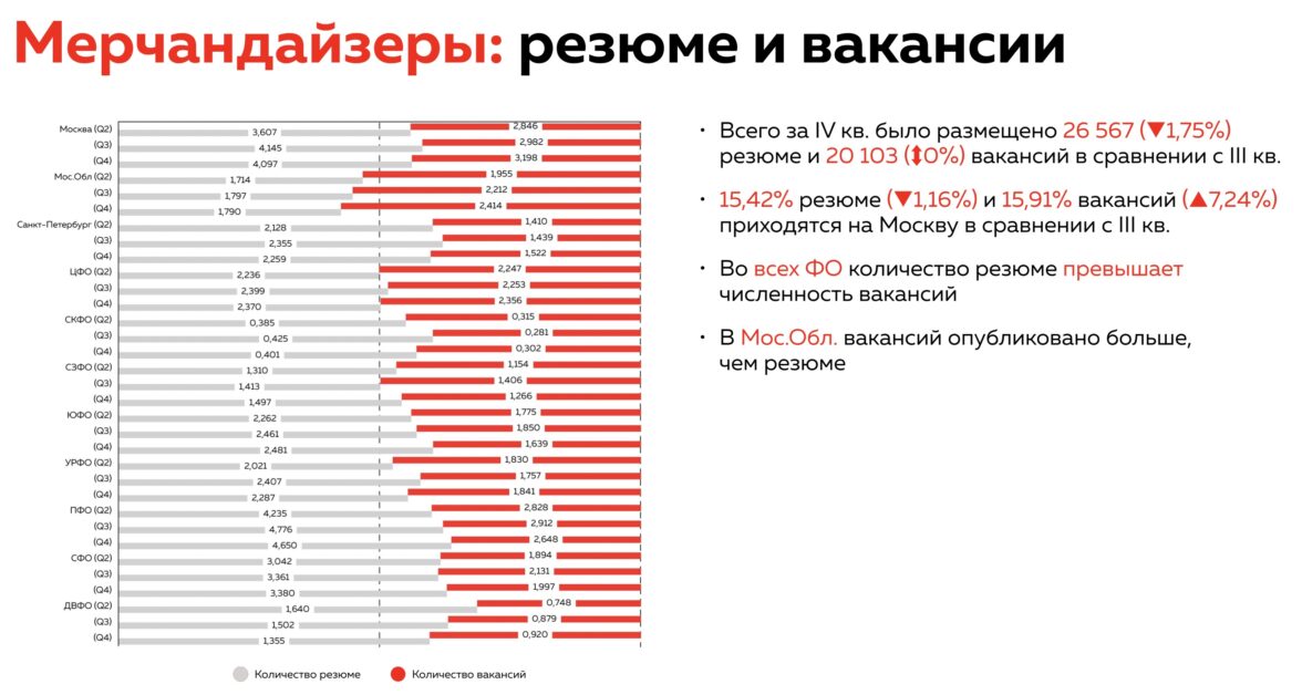 Рынок мерчандайзинга, наоборот, продолжает испытывать кадровый голод: индекс соотношения активных резюме и вакансий в четвертом квартале по всей России составил всего 1,3: 26,6 тыс. резюме к 20,1 тыс. вакансий. В Московской области вакансий было опубликовано больше, чем резюме (1,96 тыс. вакансий и 1,71 тыс. резюме). Больше всего мерчендайзеры нужны в сферах «Продукты питания», «Розничная торговля» и «СМИ, маркетинг, реклама, БТЛ, PR, дизайн, продюсирование».