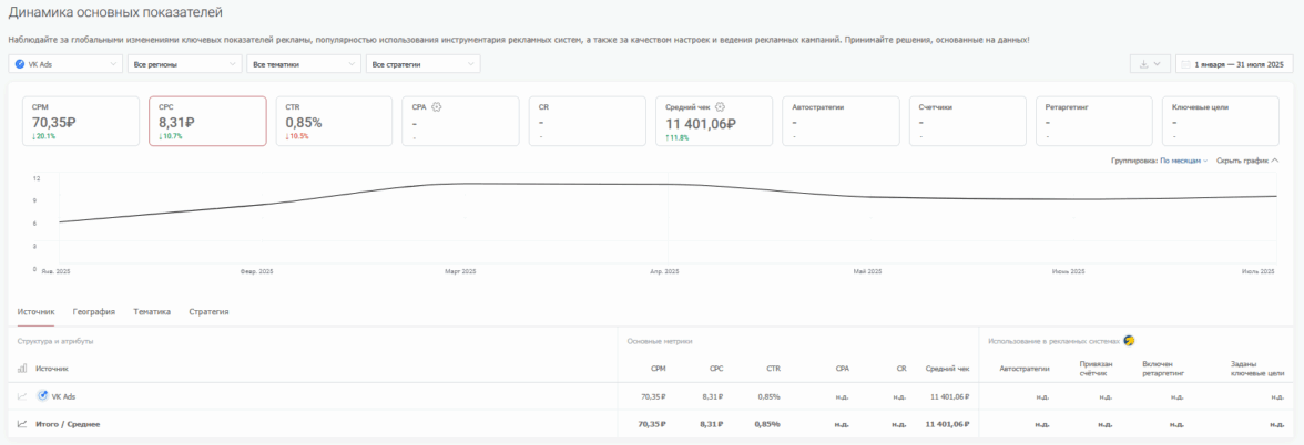 На цены влияет тематика бизнеса. Собрали усредненные данные из «Пульса” click.ru на первую половину 2025 года. ”Пульс» — инструмент с обезличенными данными тысяч рекламодателей. Статистика считается практически в режиме реального времени. В сервисе можно узнать CPC, CTR, CPM, CPA, CR за любой отрезок времени.