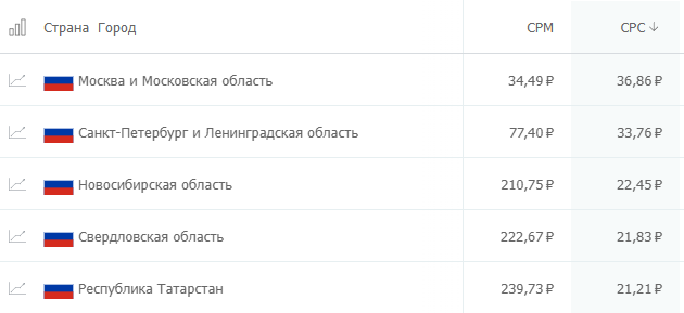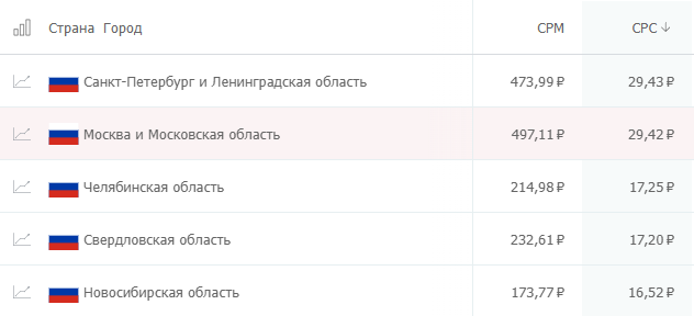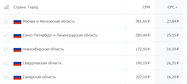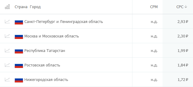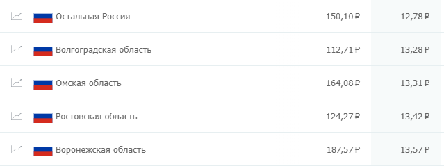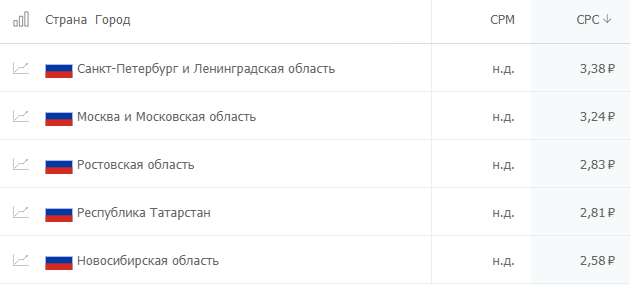 Перейдем к географическим показателям. В самых «дорогих» регионах цена клика на начало интересующего нас периода была следующей: