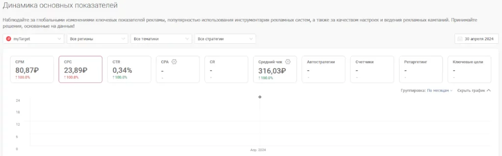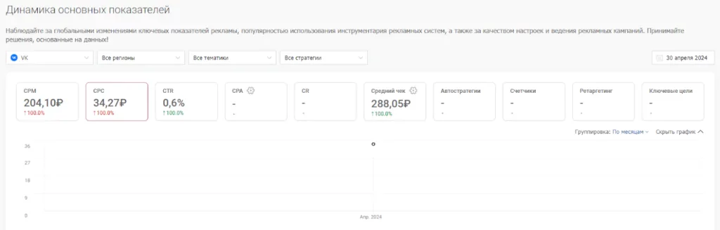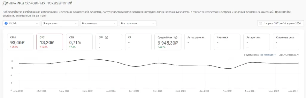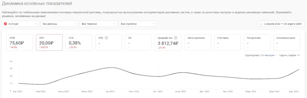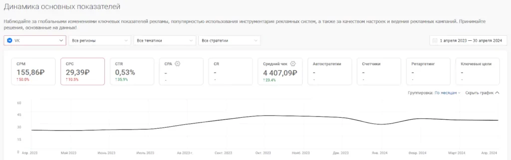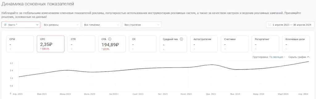При медиапланировании нужно обязательно анализировать информацию о площадке, на которой вы планируете размещать рекламу. И один из важных параметров — CPC — стоимость клика. Сервис click.ru провел исследование и сравнил CPC в наиболее популярных рекламных системах. Посмотрим данные за год с апреля 2023 по апрель 2024 года, а также проанализируем статистику на начало и конец этого периода.