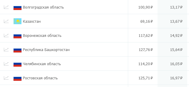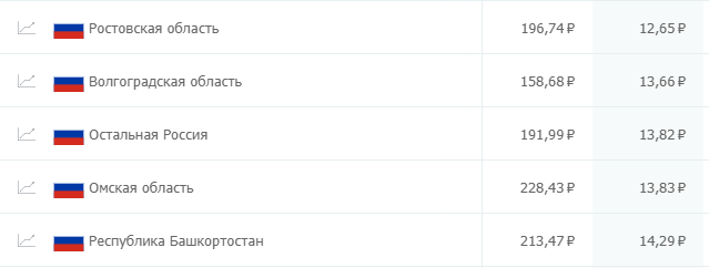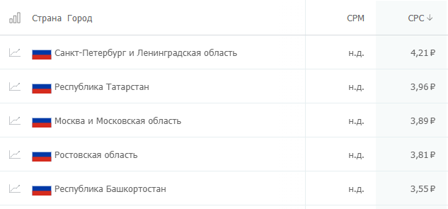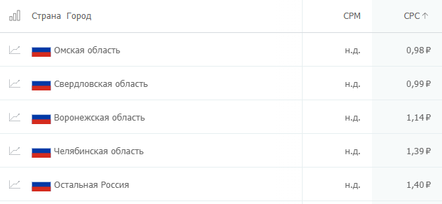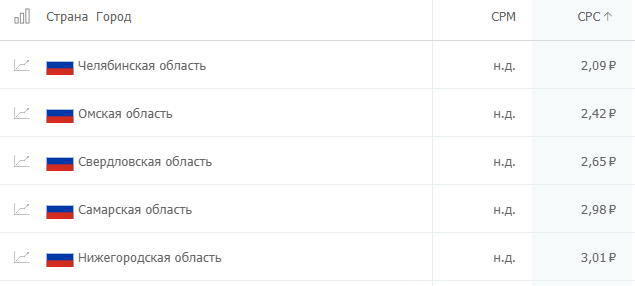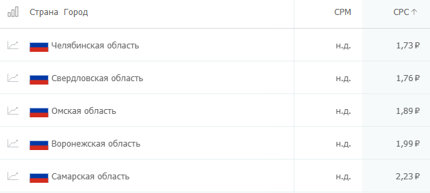 Теперь рассмотрим регионы, где можно получить самые дешевые клики.