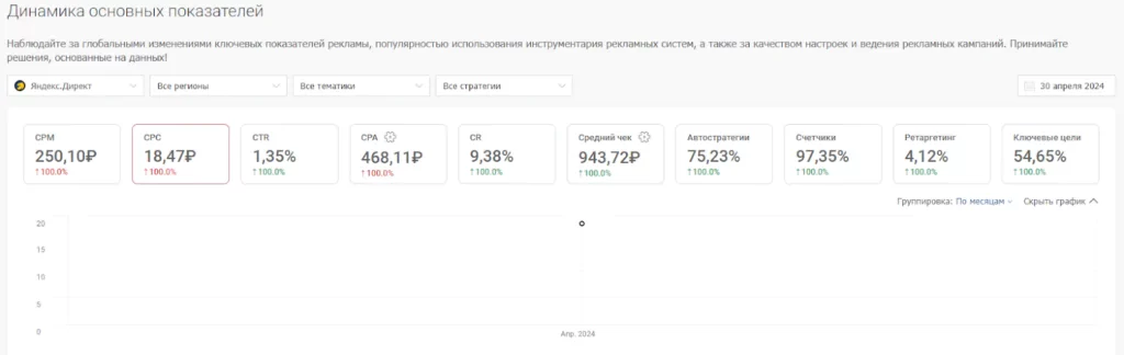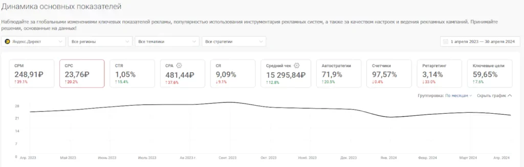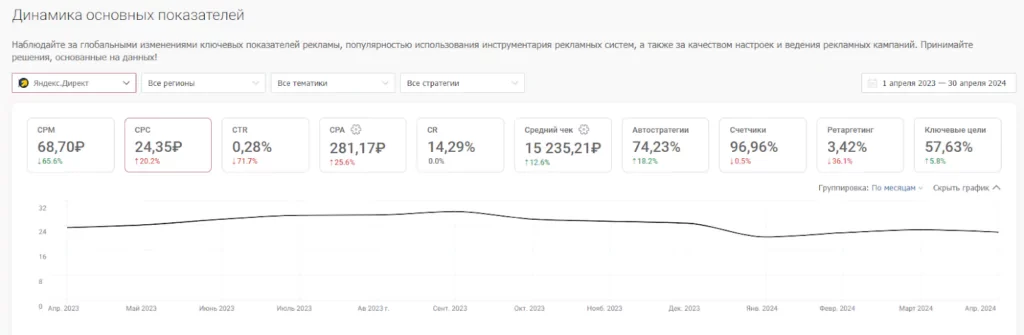 Для исследования использовался инструмент сервиса click.ru — «Пульс рекламного рынка». Он позволяет анализировать динамику по рекламным системам, тематике или географии. «Пульс» показывает CPC, CTR, CPA и средний чек по нише за заданный период. Это помогает изучать рынок, анализировать конкурентов, планировать бюджет и многое другое. Инструмент можно встроить на собственный сайт, чтобы всегда быть в курсе изменений и предоставлять посетителям уникальную и полезную статистику.