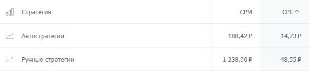 Из раздела «Стратегии» в «Пульсе click.ru» узнаем, что цена клика при использовании автостратегий более чем в 2 раза ниже, чем при ручном управлении.